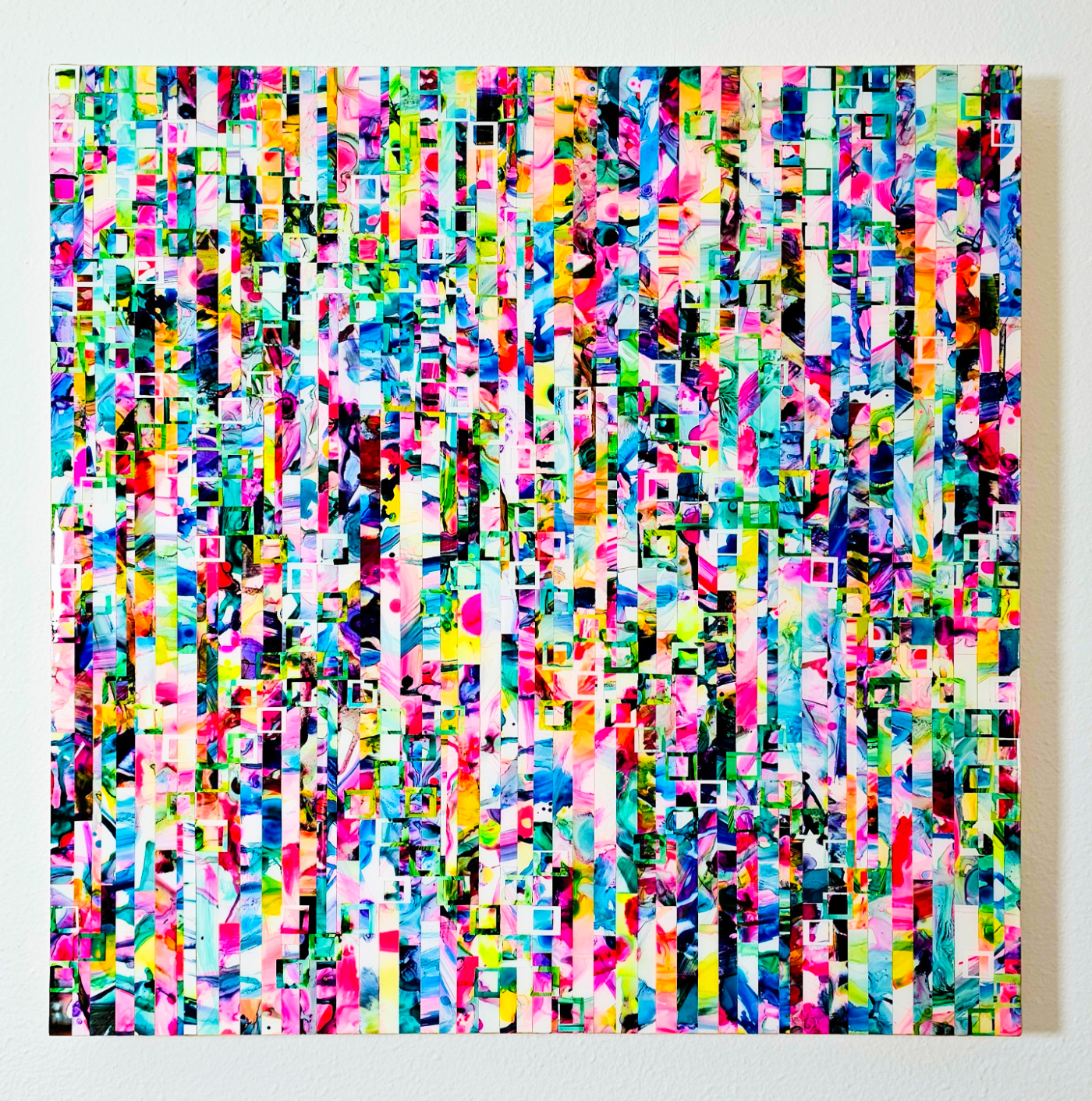 Lindsey Waters is a contemporary abstract collage artist based in Shreveport, LA. She holds a BFA in Studio Art from Louisiana Tech University, graduating in 2012. Waters creates intricate and highly detailed collages from original paintings, which she meticulously cuts into strips no wider than ¼ inch. Her paintings are crafted using acrylics, watercolors, alcohol inks, and various textural materials on synthetic paper, which are then transformed into collage strips. The themes in Waters’ work revolve around change, reincarnation, impulsivity, and improvisation. Each collage represents a transformation, an exploration of beauty and creation emerging from destruction.